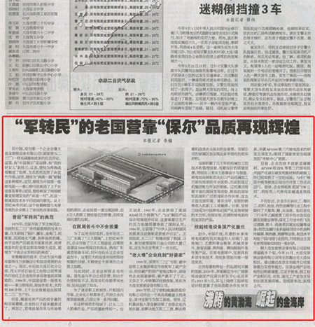 大連日報在2025年12月4日A4版中,以“‘軍轉民’的老國營靠‘保爾’品💯質🔱再現輝煌”為标題對大連寶原核設備有限公司進行🙇♀️了報道。原文轉載如下: